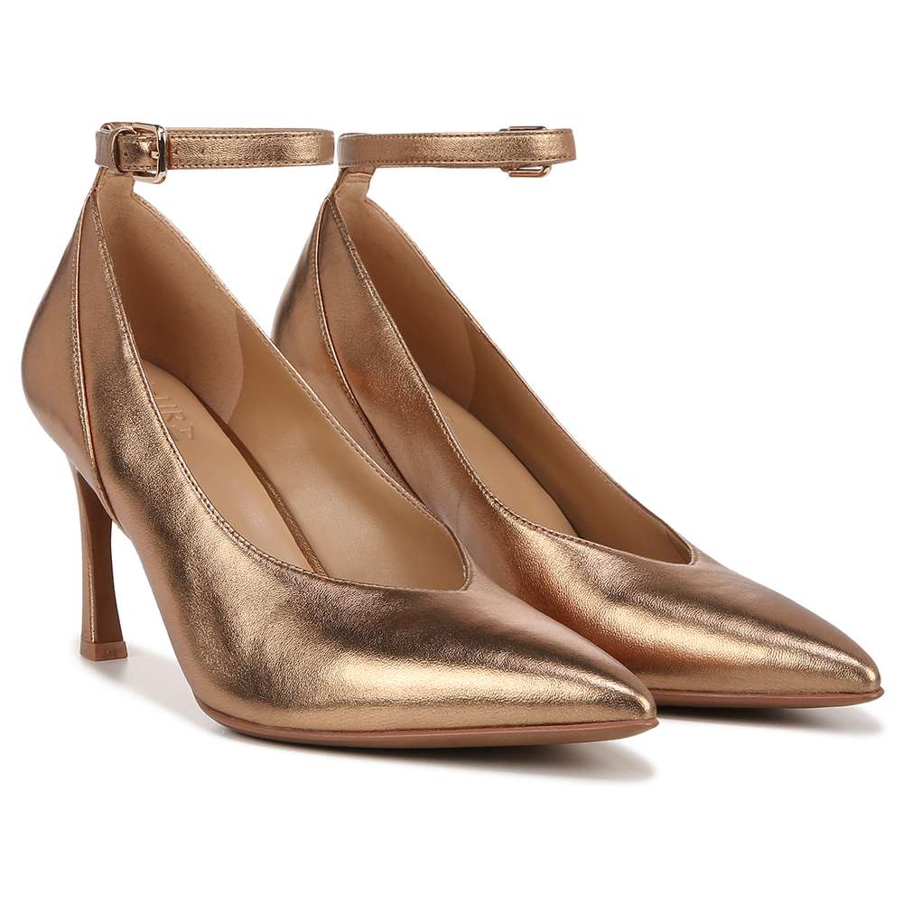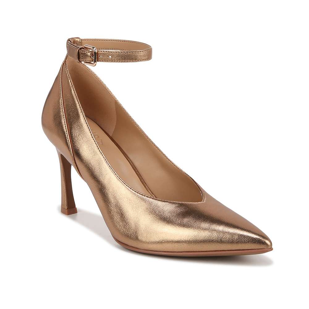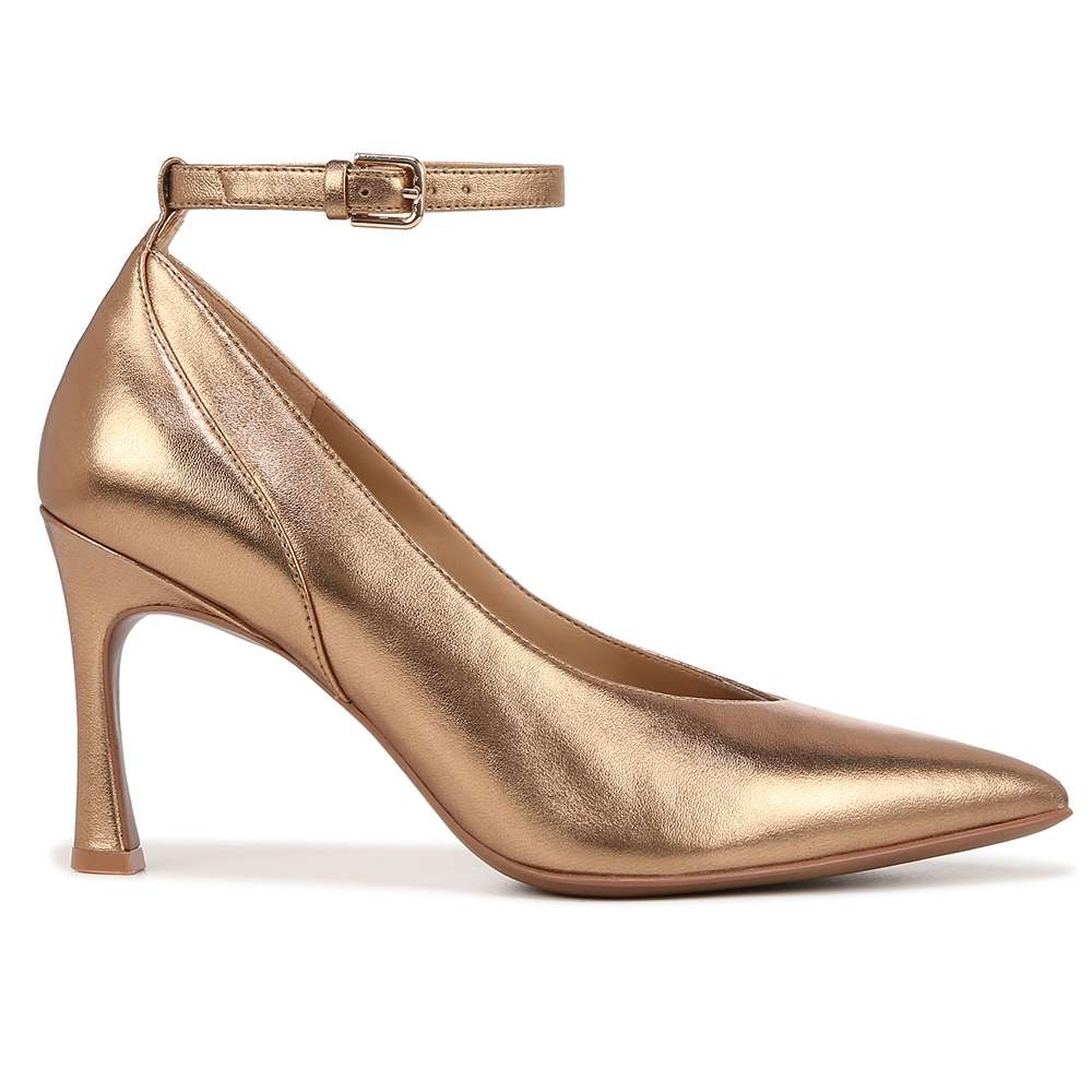 Chic beyond belief. Dressed in all-day comfort, this pointed dress pump with a V-shaped topline and easy adjustable ankle strap is a need-now staple.