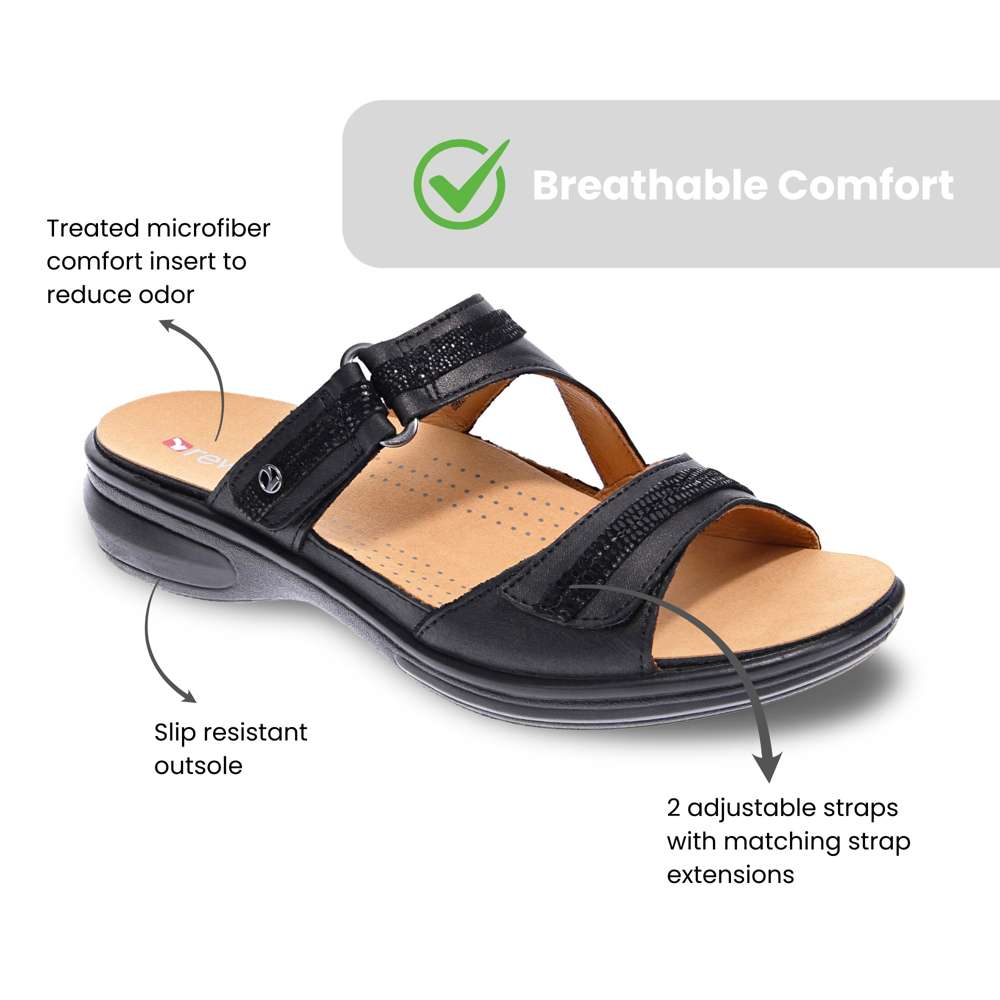 Shiny snake uppers steal the spotlight on Rio, a double-strapped women’s slide sandal with delightful detailing. In vibrant red, deep blue or lustrous black, Rio combines subtle adjustability with metallic accents and textured patent leather. For a look that’s anything but basic, our Rio slides are the best orthotic sandals Australia has to offer.